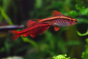 Другое впечатление создаёт аккуратный мелкий как неон, всего до трёх сантиметров, вишневый барбус (Barbus titteya). Также неприхотлив в содержании. И к тому же в разведении. При достаточно заросшем растениями аквариуме можно дождаться молоди ничего не предпринимая.